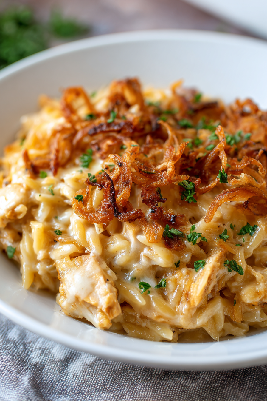 French Onion Chicken Orzo Casserole