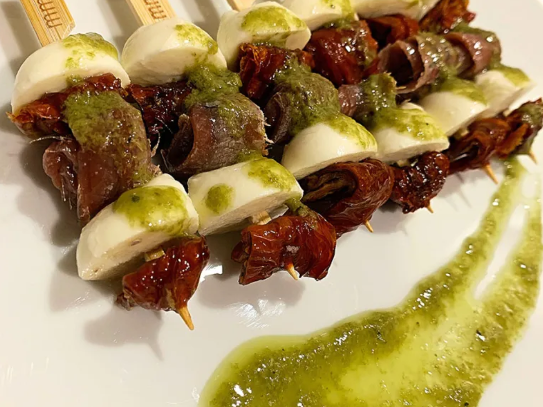 Mini brochetas de anchoa, mozzarella i tomate seco