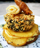 Crocanti de morcilla Rios sobre lasaña de manzana y queso