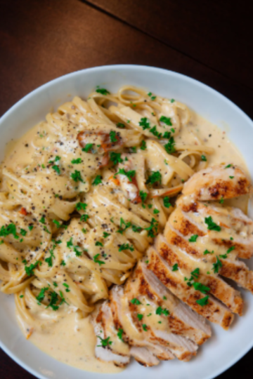 Grilled Chicken Breasts with Sun-dried Tomatoes & Parmesan Cream Sauce on Fettuccine
