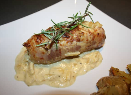 Coupez les ballotines en tranches épaisses pour révéler le cœur fondant au Comté. Disposez-les harmonieusement dans l’assiette, nappez de sauce et ajoutez quelques herbes fraîches.