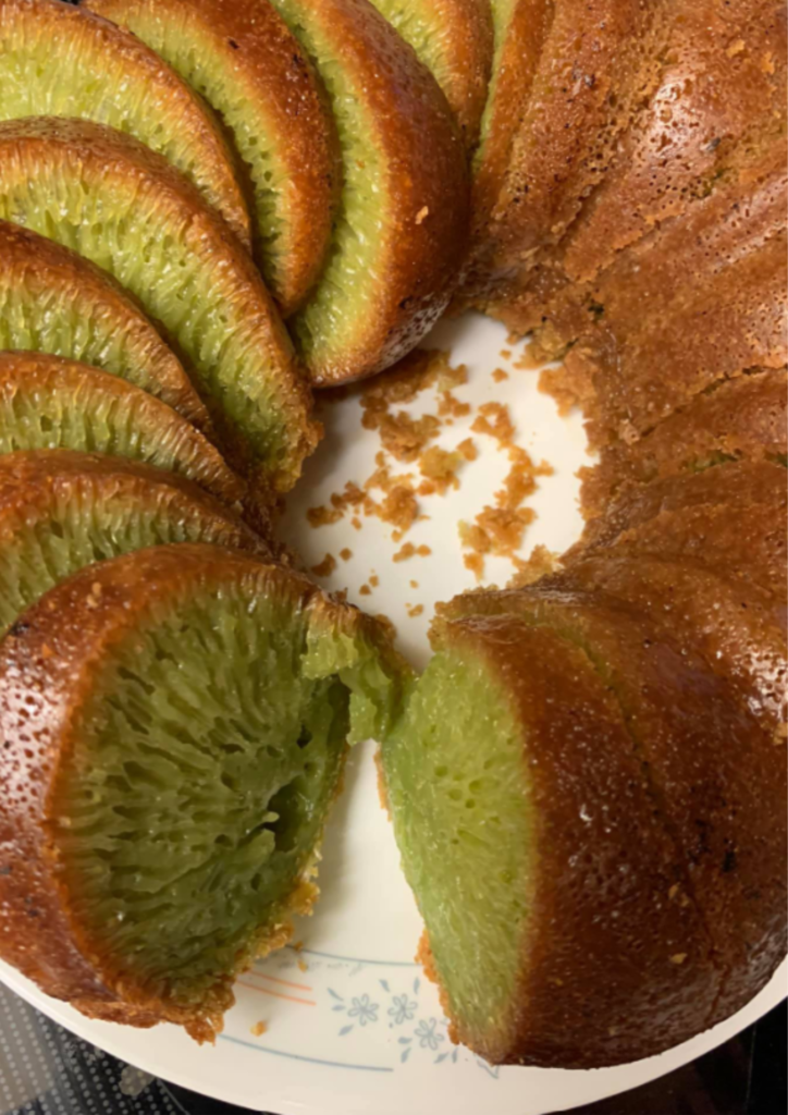 Pandan leaves are widely used in Southeast Asian desserts for their sweet, grassy aroma. The extract gives the cake its signature green color and fragrance.