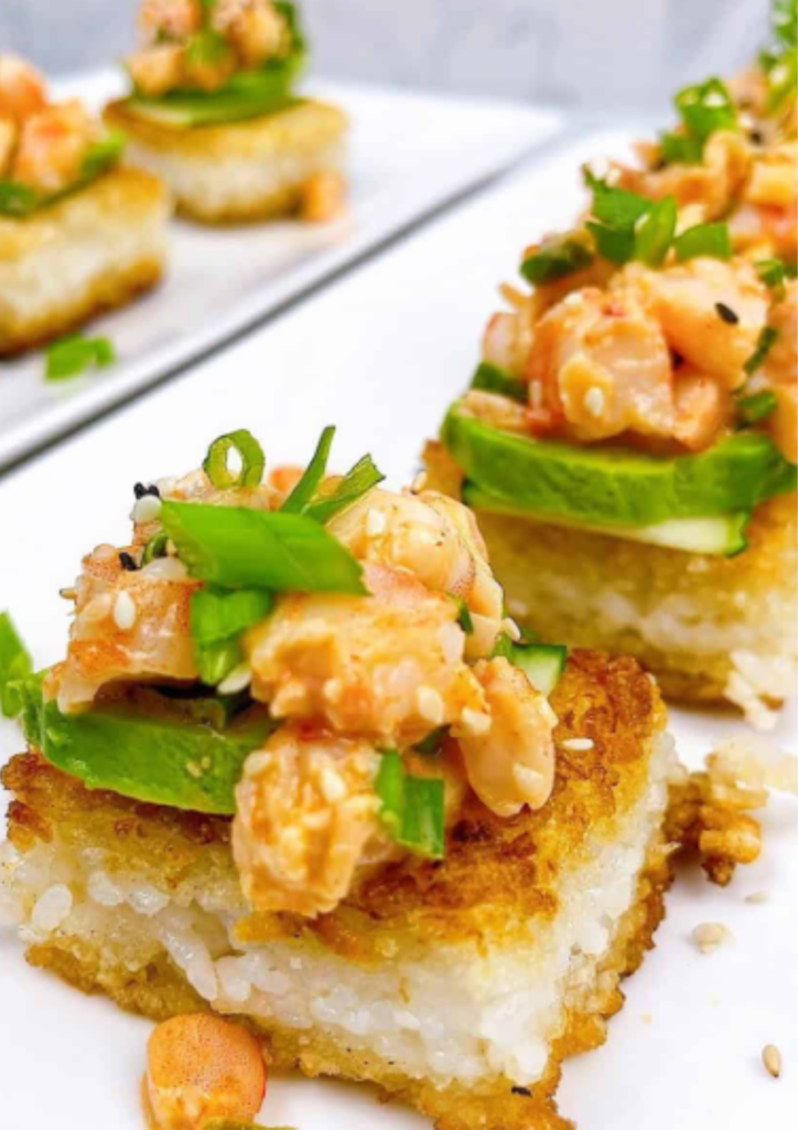 Serve the crispy fried rice and shrimp bites warm for the best texture.