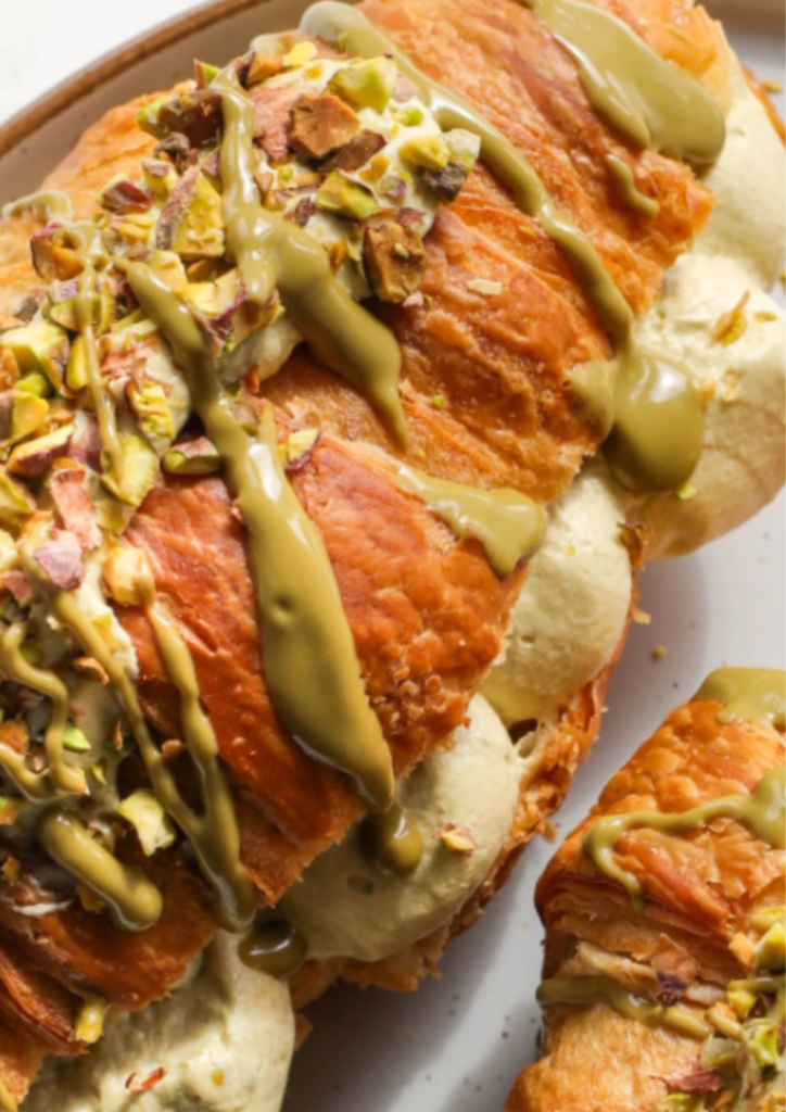Spread a generous layer of pistachio cream inside each croissant. Close them gently.
