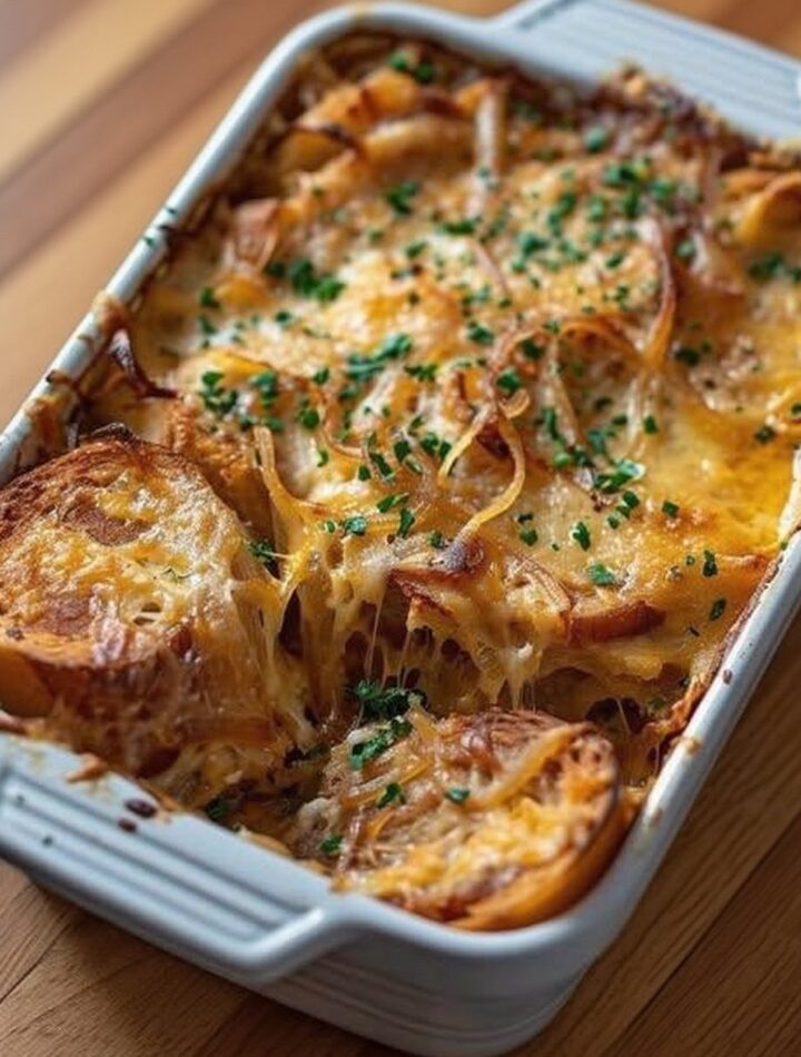 All the cozy, caramelized flavors of French onion soup ā transformed into a hearty, bubbling casserole! This dish layers sweet onions, rich broth, melted cheese, and crispy bread for the ultimate comfort food that tastes like a warm hug from France.