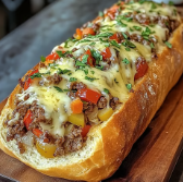 If garlic bread and a Philly cheesesteak had a love affair, this would be the result. A crusty loaf of bread, hollowed and stuffed with tender beef, sautéed onions and peppers, gooey melted cheese, then brushed generously with garlicky butter and baked until golden and bubbling. This is not a side dish—it’s the main event.