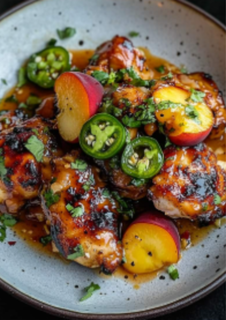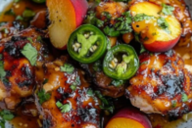 The peaches melt into a silky glaze, the jalapeños add a lively kick, and the caramelized chicken ties it all together into something truly unforgettable.
