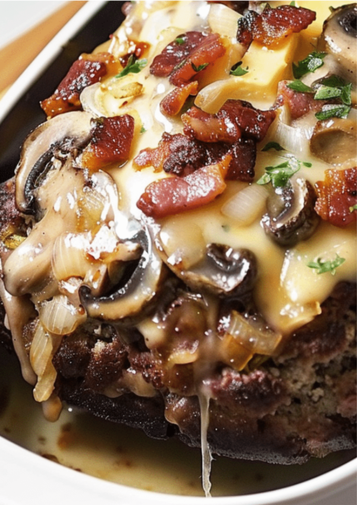 Mushrooms provide umami richness that enhances the beef’s natural flavor. Swiss cheese melts smoothly and offers a mild nutty taste that complements the earthiness of mushrooms. Together, they create a balanced, savory combination reminiscent of a gourmet burger — but in comforting meatloaf form.
