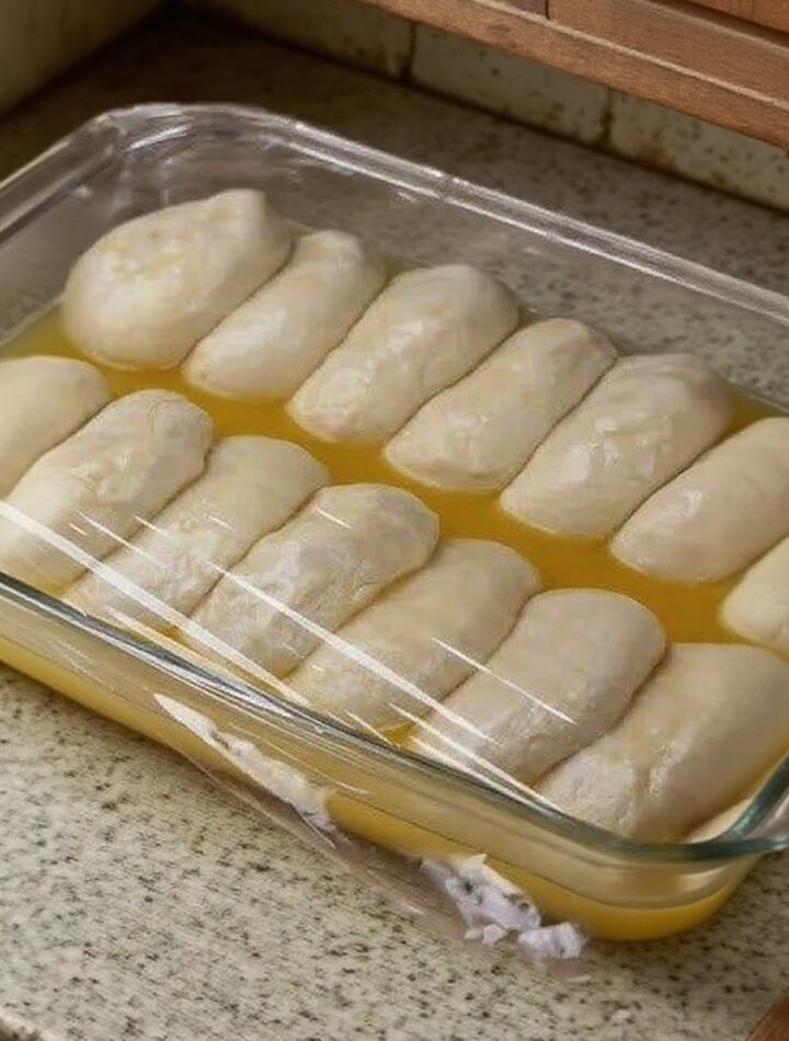 4. Place rolls in dish. Heat 2 cups milk with remaining butter and sugar until warm (don’t boil). Pour over rolls.
