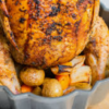 Coloca el pollo relleno en una bandeja para horno. Rodea con papas, zanahorias y cebolla. Vierte el caldo de pollo en la base para mantener la humedad.