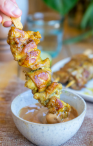 Disposez les brochettes sur un plat chaud. Servez la sauce cacahuète :