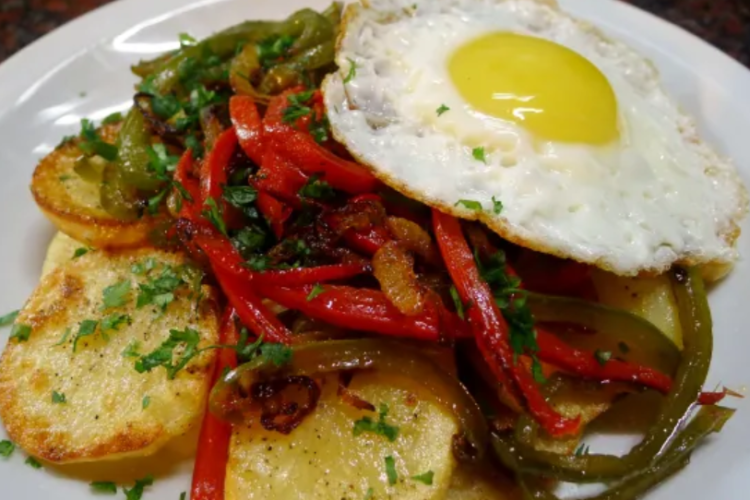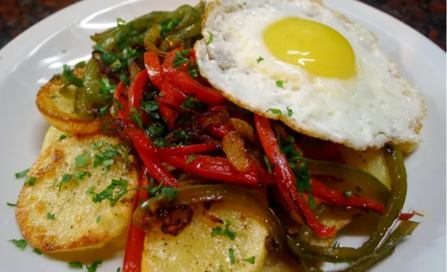 Este plato combina patatas tiernas, cebolla dulce, pimiento, ajo y aceite de oliva virgen extra, todo cocinado lentamente hasta quedar confitado. El huevo al final aporta cremosidad y convierte la receta en una comida completa, nutritiva y reconfortante. Es cocina de casa, de la que huele a domingo y a recuerdos.
