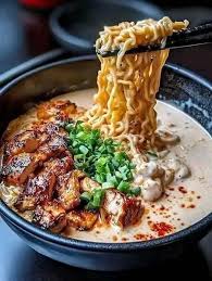 If you love dishes that balance intense heat with rich, velvety comfort, this Spicy Fiery Chicken Ramen with Creamy Garlic Sauce will hit every craving you didn’t even know you had. Picture this: tender slices of chili-marinated chicken, pan-seared until caramelized and juicy; a broth that’s both spicy and soothing, infused with garlic, butter, and a hint of cream; and noodles perfectly springy, catching every droplet of that addictive, glossy sauce. It’s a modern, fusion-style ramen—fast enough for a weeknight but special enough to feel like a restaurant indulgence.
