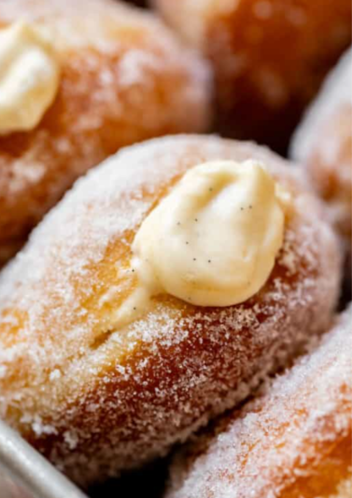 Bavarian cream (also known as Crème Bavaroise) is a luxurious custard enriched with cream and traditionally lightened with gelatin. For donuts, we use a stabilized pastry cream version that’s thick enough to pipe but still smooth and creamy.