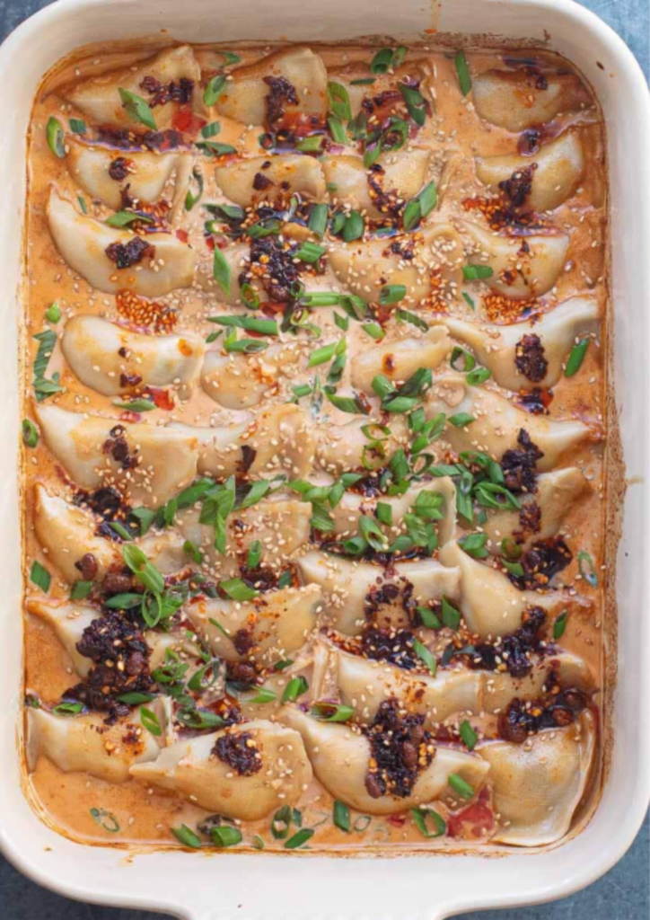 The beauty of this recipe is its flexibility. You can use chicken dumplings, pork dumplings, vegetable dumplings, or even gyoza. As the dumplings bake in the creamy sauce, they absorb all the flavor while staying tender inside and slightly crispy on top. The result is a comforting one-pan meal that feels indulgent yet incredibly easy to prepare.